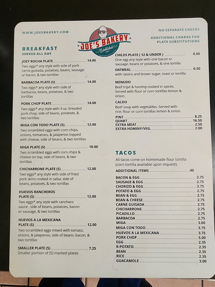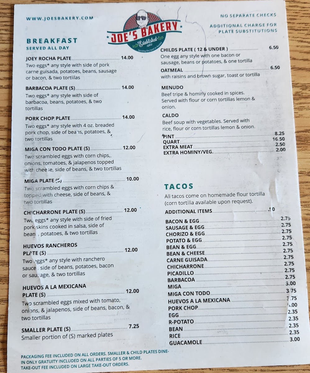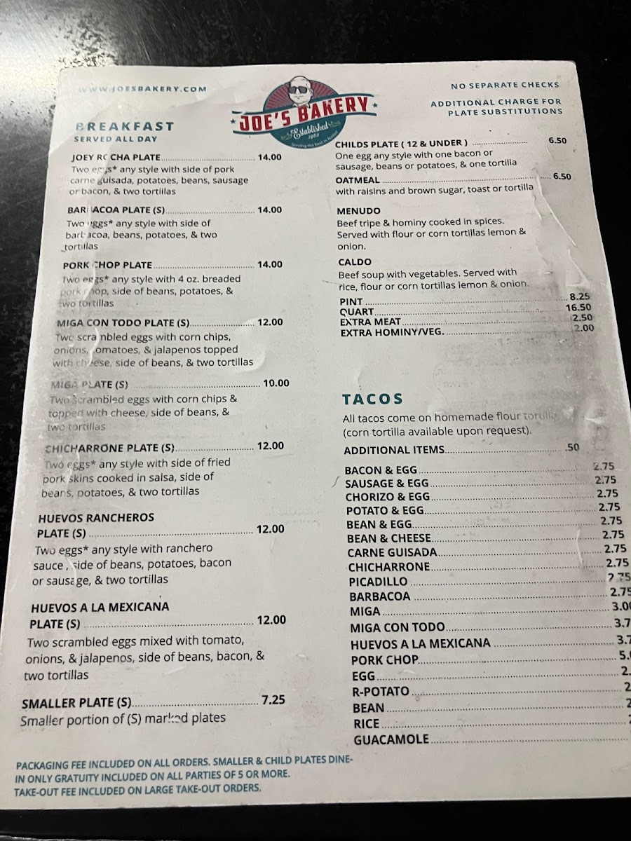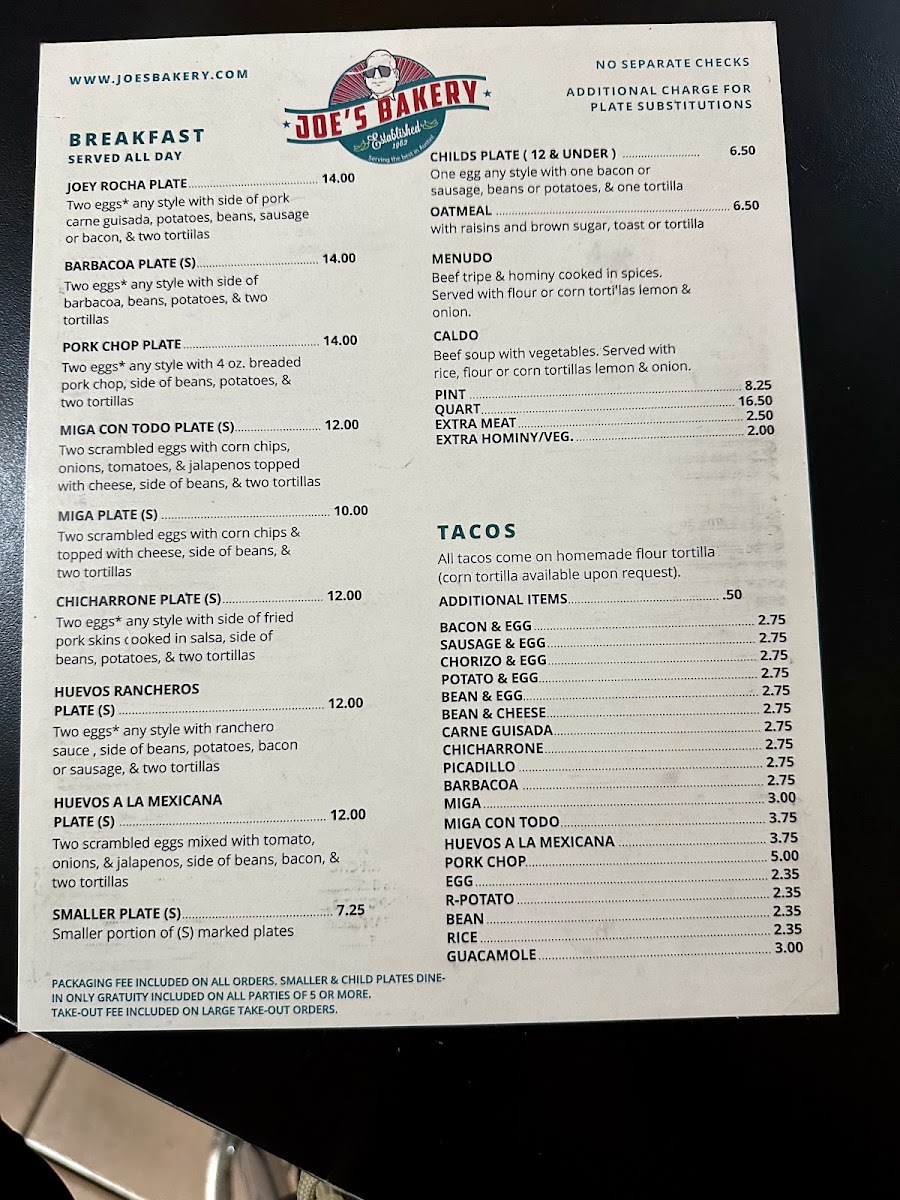 Indulge in a vibrant array of delectable offerings, starting with their mouthwatering breakfast plates. The Joey Rocha Plate features perfectly cooked eggs paired with succulent pork carne guisada, crispy potatoes, and soft tortillas, all for just US$14.00. For a taste of the traditional, don’t miss the Baracoa Plate, which tantalizes your taste buds with seasoned barbacoa and hearty sides. Other crowd favorites include the Pork Chop Plate and Migas Con Todo Plate, making it clear why Joe’s is known for its bold flavors and generous portions.